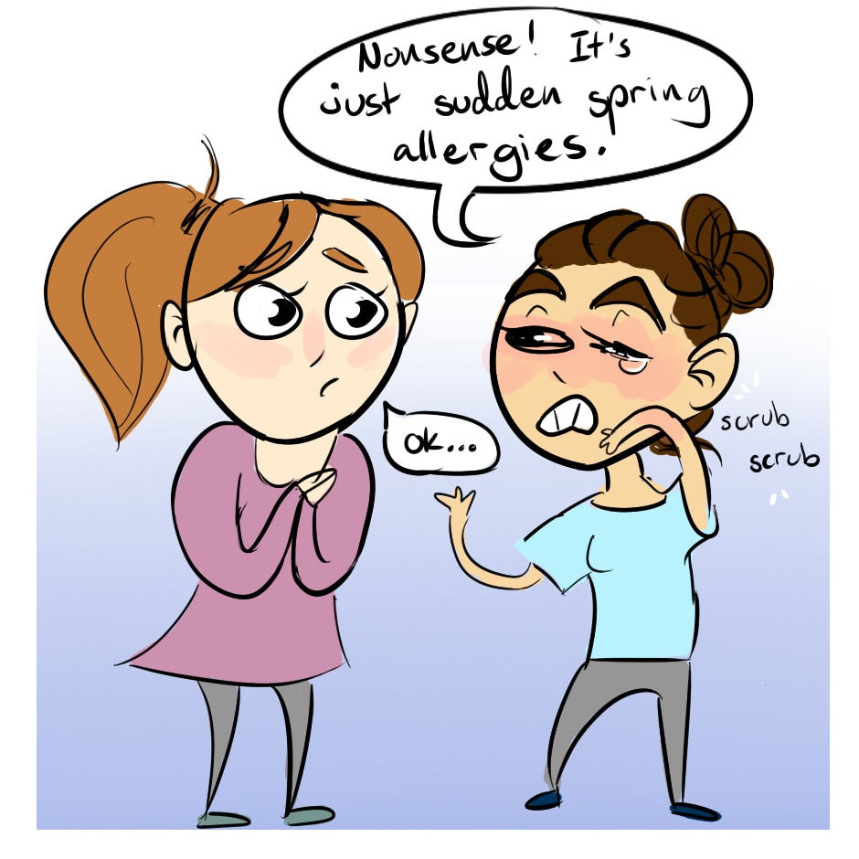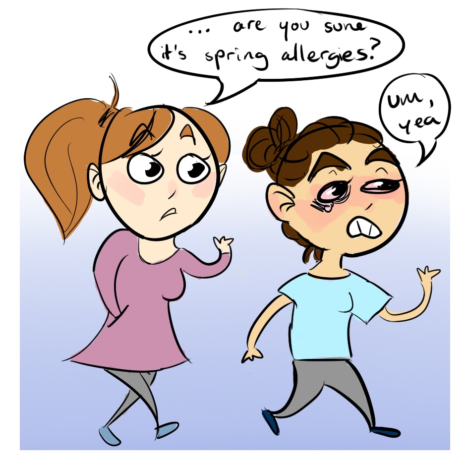 "I just don't get it. I've never been this badly allergic to pollen before!" "..."