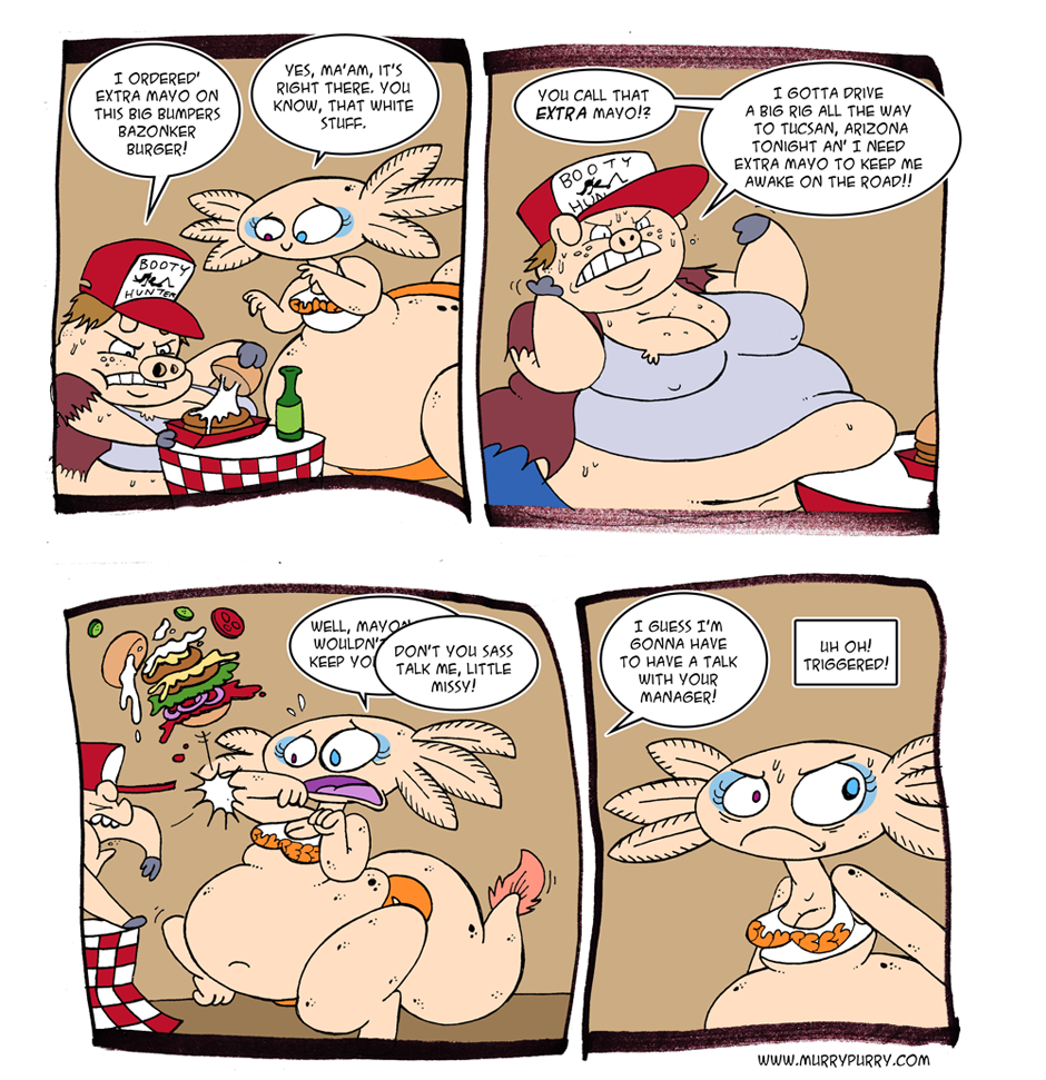 I hope this doesn't come off as a joke about "trigger warnings" cuz jokes about trigger warnings are stupid and old. Also it's weird how people get so angry about trigger warnings but they don't notice them if you don't use the word "trigger." Like, if you just say WARNING! or CAUTION! or BE AWARE! none of the pepes seem to even notice that you're essentially putting a trigger warning on it because it doesn't contain the magic word that seems to, for lack of a better term, trigger them. Anyway. Enjoy this comic about fats.
