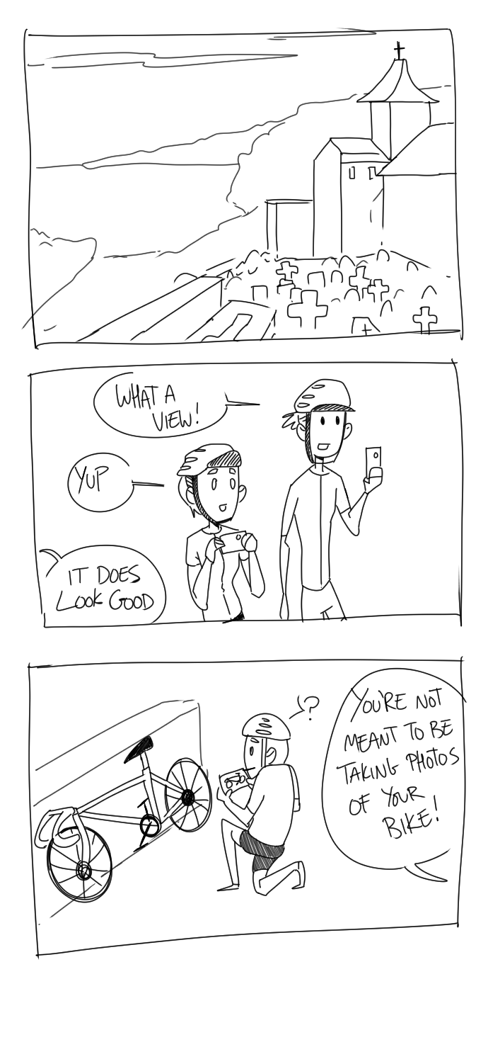 We cycled to a church on the coast thanks to the advice from a random French man out on a run. [Edited 2021, traced digitally]
