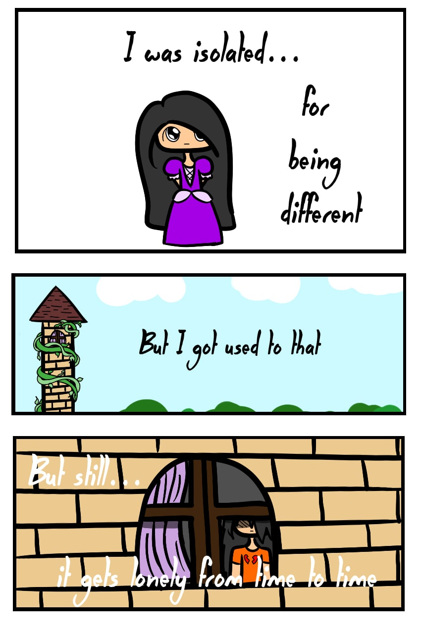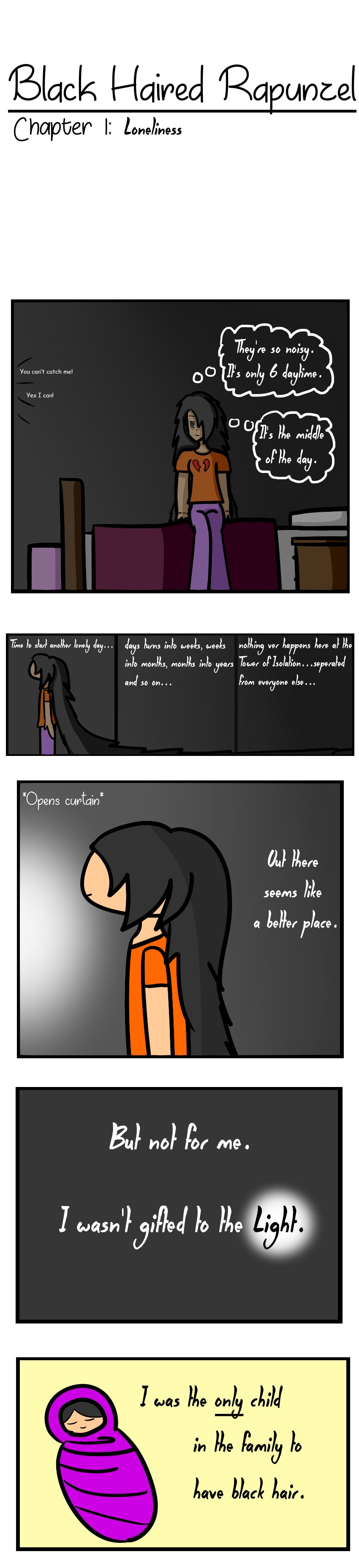 Being isolated for being different, that's how this society was able to survive. The longed hair girl named Rapunzel had many children, but one of them didn't have blonde nor brown hair. She is now isolated in the Tower Of Isolation, until one day....