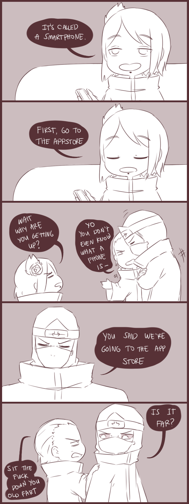 This is... THE BEST THING!!!!! OMG IMAGINE KAKU-CHAN IN BORUTO. He would be so confused at first like "laptop?? We don't need that nonsense hidan" and the rest of the akatsuki would be like "no Kakuzu u need 2 go the internet for you emails" and kakuzu just saying fake news. But in reality he is embezzling from like 15 companies and owns a blog.