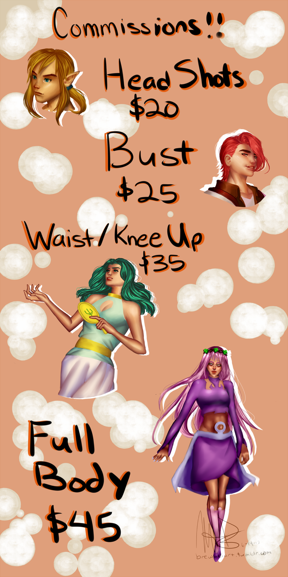 Hey guys if anyone is interested I'm taking commissions and I'm in need of funds. I've got about ten slots open so please message me on my tumblr at brewskiart.tumblr.com or email me at brewermichael79@gmail.com so we can figure out all the details.