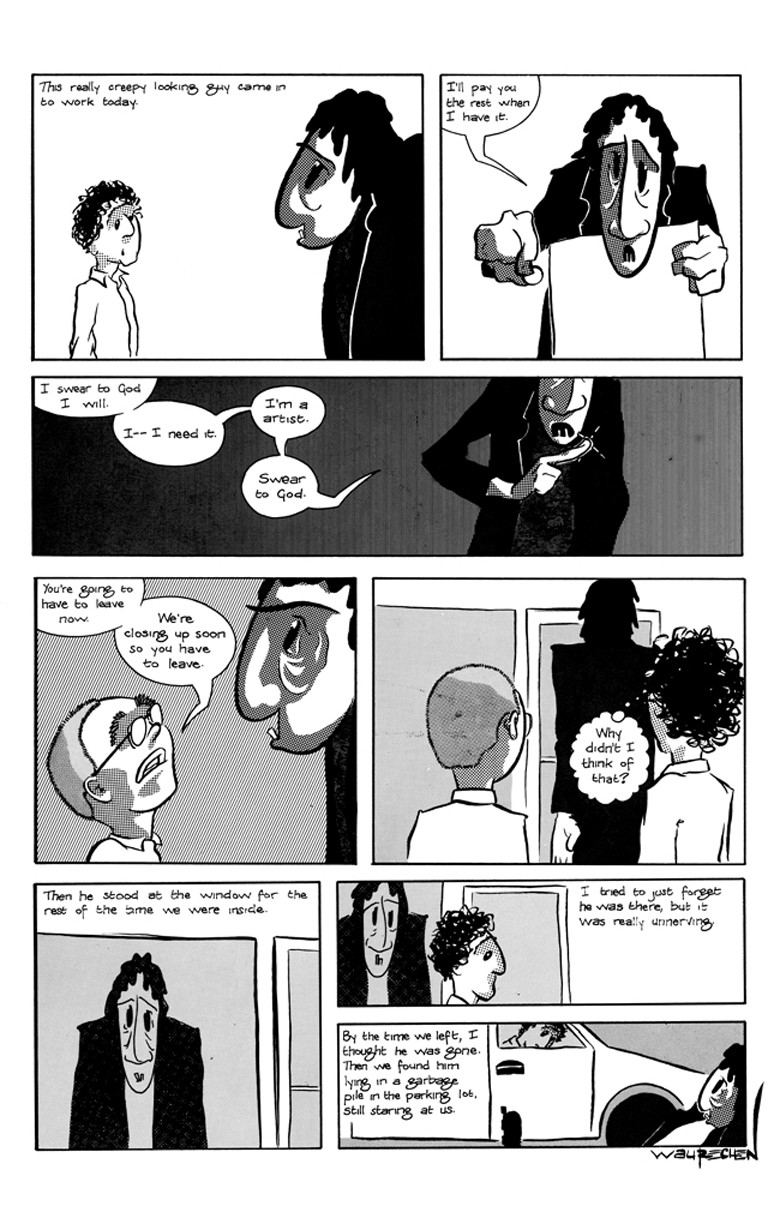 A giant homeless man came into the art supply store one day...