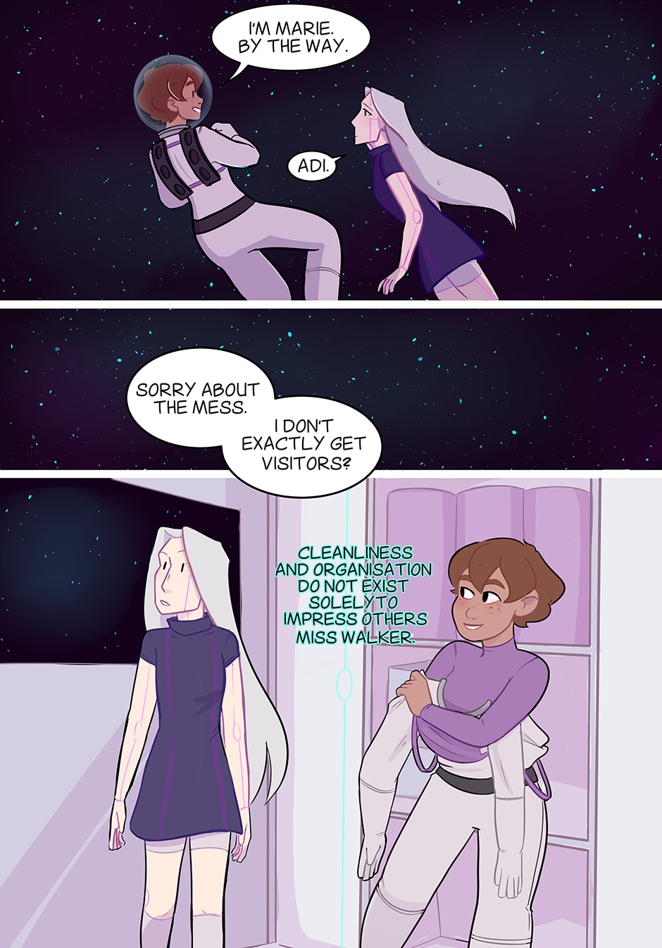 Is that the ship/motherboard talking? At least they know how to impress a woman :P Also, the use of colors is gorgeous and Thank you for all of the pages once again! Are you by any chance getting extremely exhausted by pumping out so many pages? I wouldn't want your health to be affected by the making/production of the comic. If not, then thanks again for all if the pages, really good story so far (Sorry for long comment)