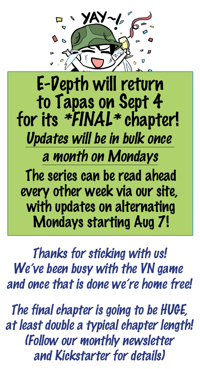 That's right E-Depth will start updating on our home site on Aug 7, updates following in bulk here on Sept 4! (As usual Patreons get early access) http://comics.mayshing.com/edepth