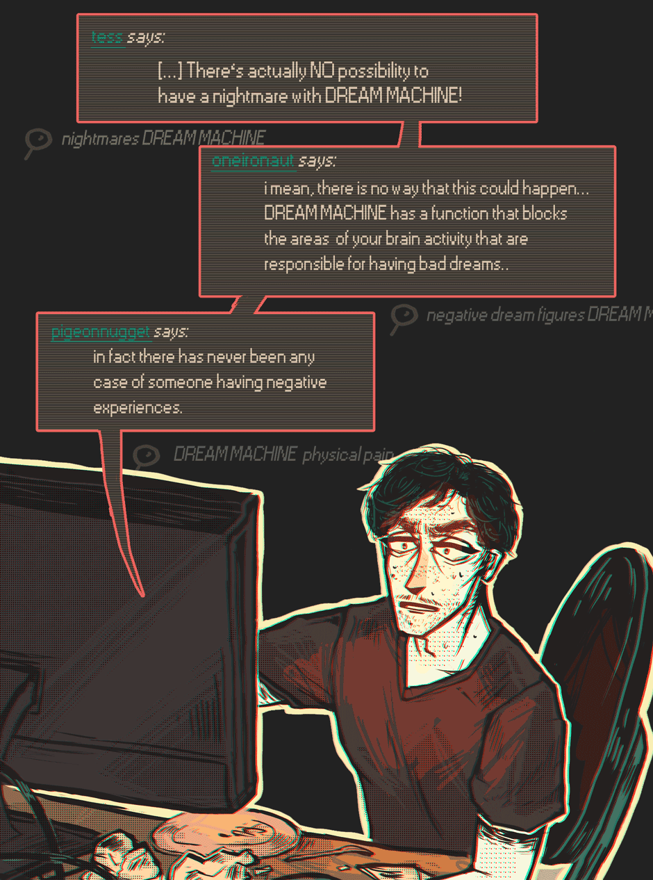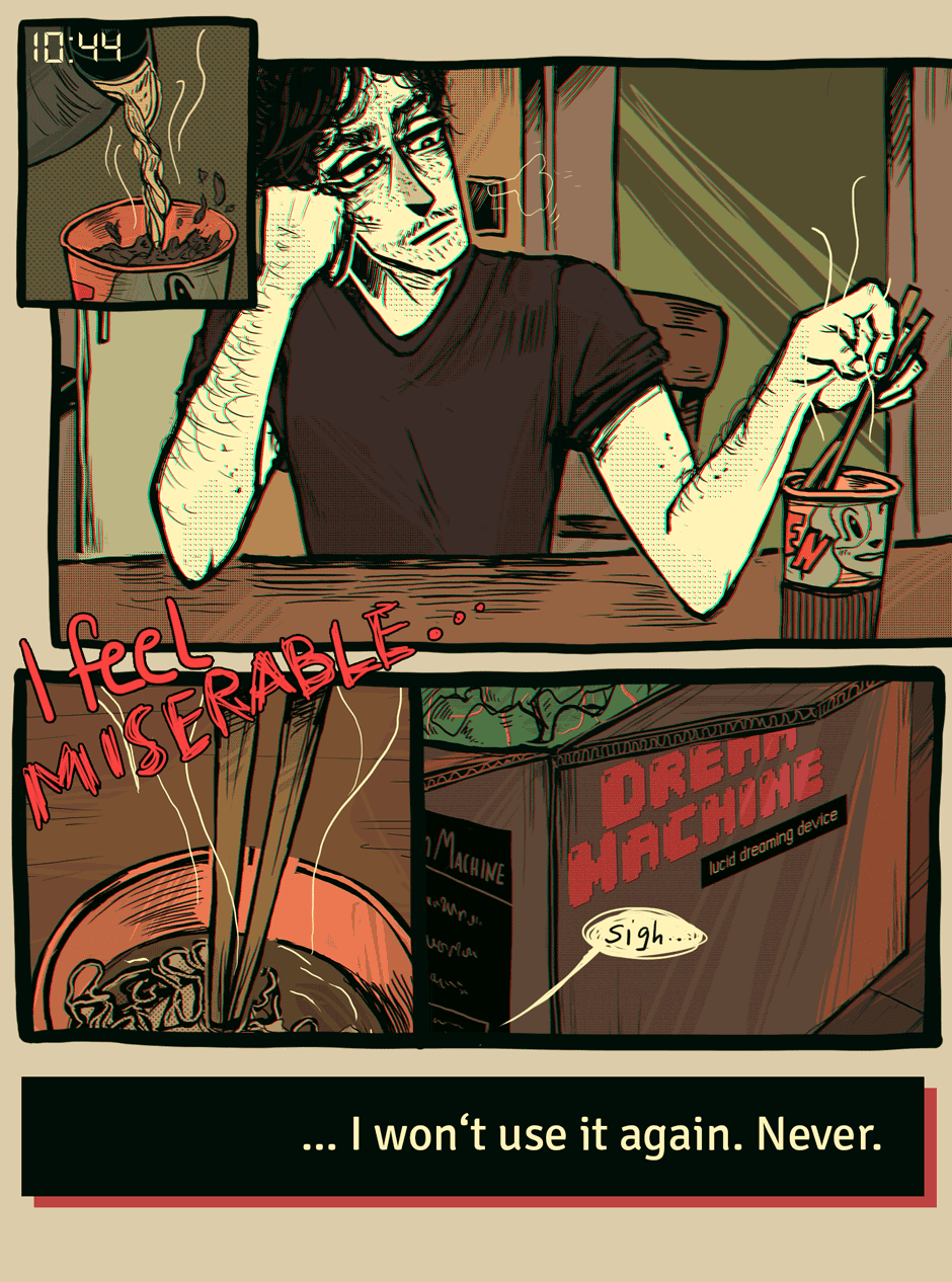The virtual device allows the user to explore the marvellous world of lucid dreaming. But Kjells version is defective! Instead of travelling through his inner dream world he has to deal with surreal environments and bizarre creatures.