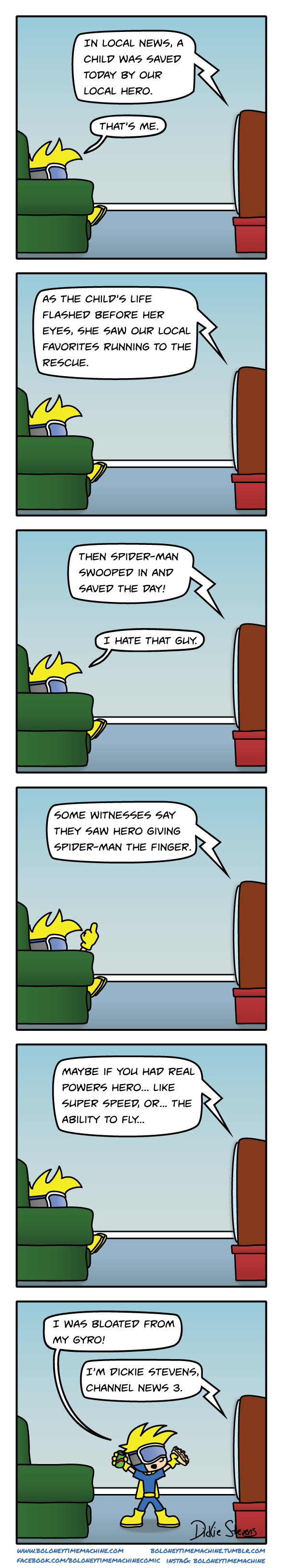 Boloney Time Machine (BTM) follows Hero and Sidekick, a pair of superheroes who just joined The Society of H.A.V.V.O.C. (Heroes, Antiheroes, Vigilantes, Villains, & Other Characters). They have the potential to be epic, but half the drive to do it.