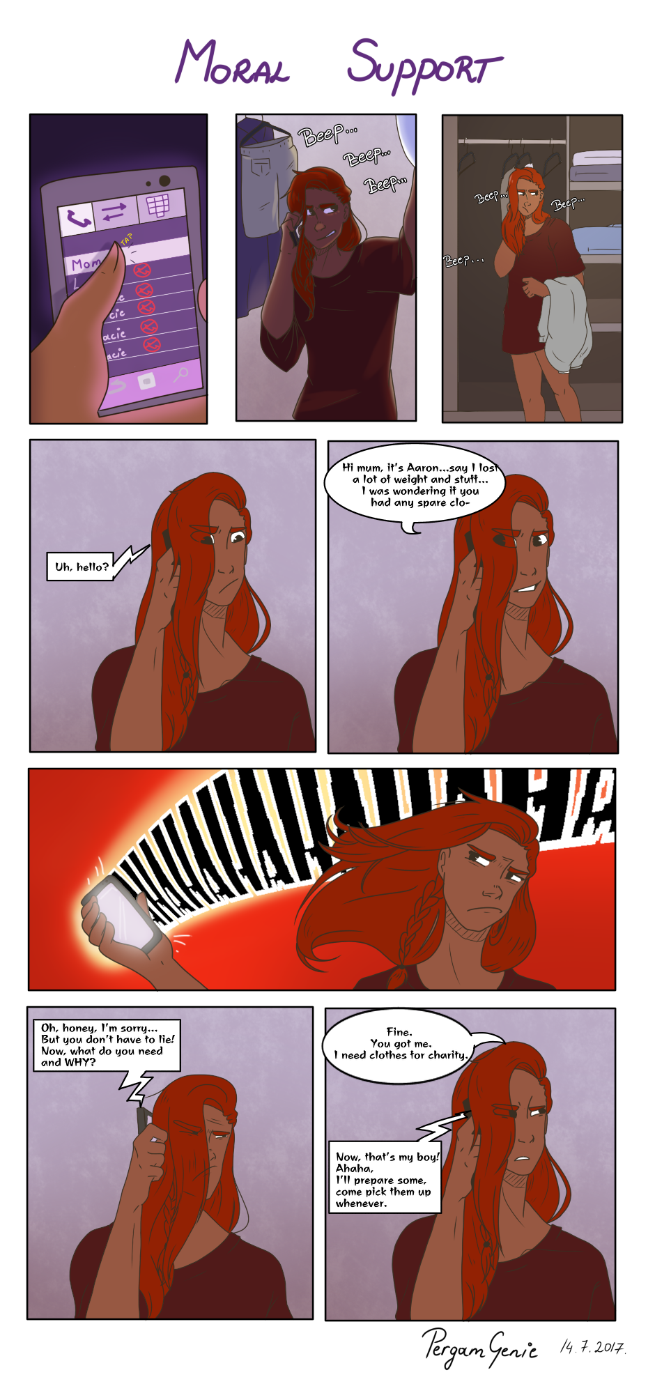 Due to his recent transformation, Aaron seems to be out of fitting clothes so he calls his mom to break her the news.