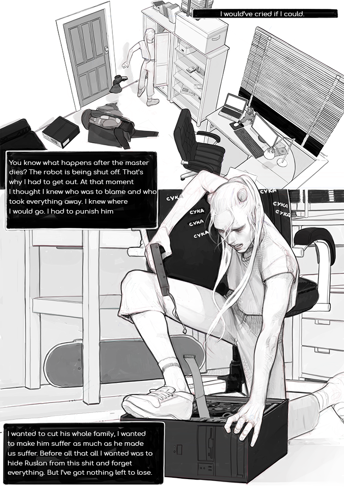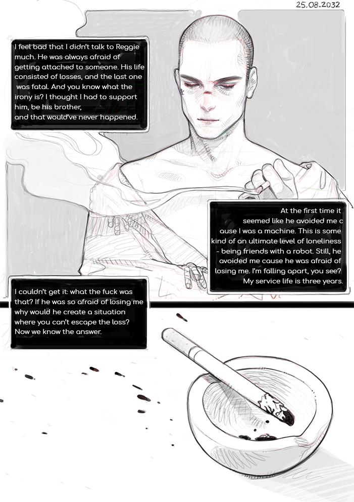 This is drama + angst. All the events take place in alternative reality where people survived a catastrophe and built a new technological world. It’s a comic about people living in this world, meeting and losing eachother, it’s a story saying that all things come to an end: good and bad. It’s a story about a robot-boy who tries to understand what being alive is like. It’s about the fear of loving, about the desire to be needed, motherly feelings and toxic friends. And much more.