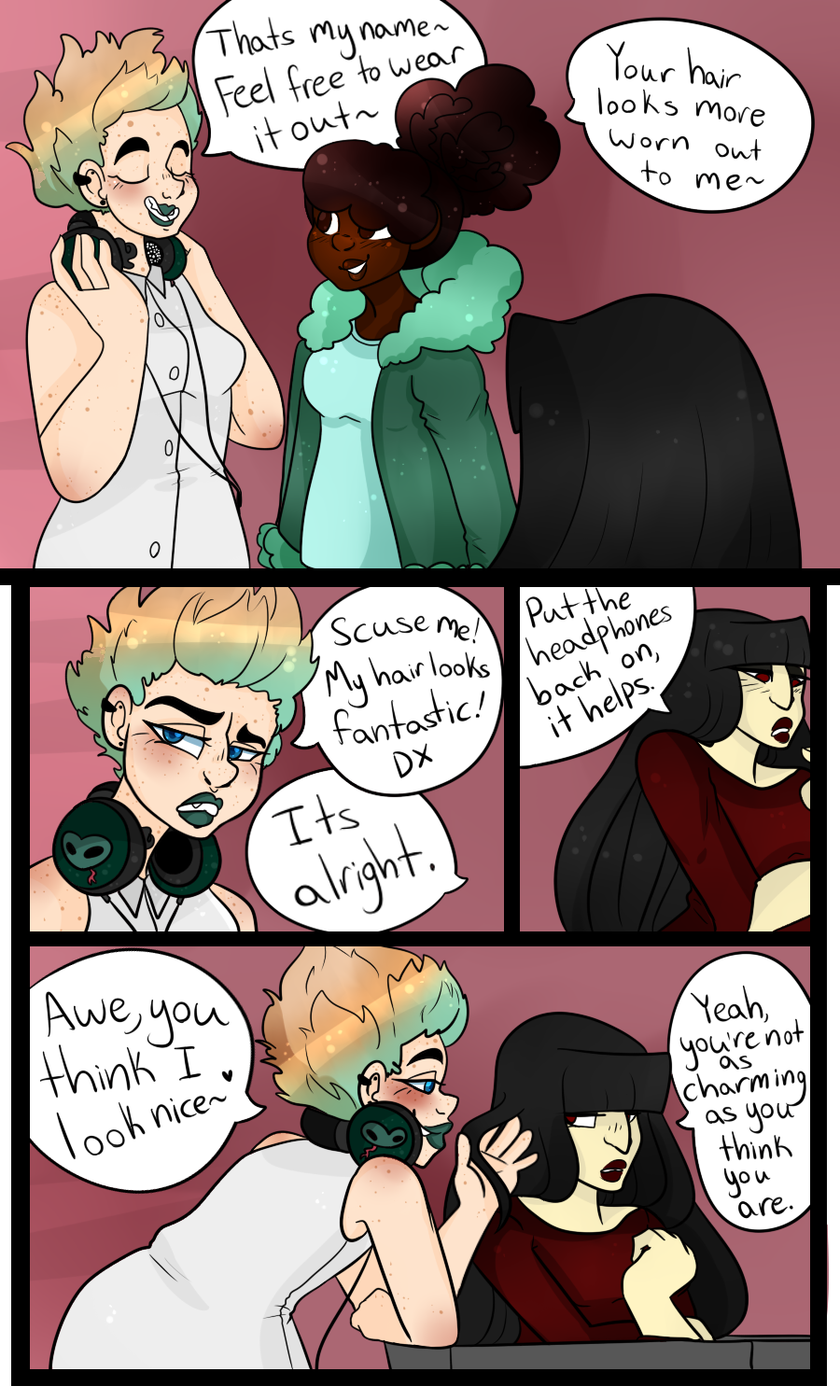 im trying out a new style for my pages. the linework is thinner and the lighting is less glossy. tell me what you think i guess hngggg,,