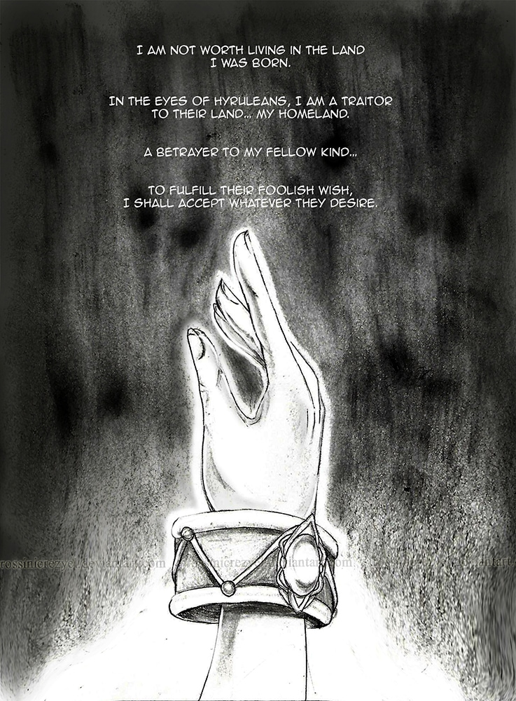 The 'Legend of Zelda', its characters and environment, and base story are owned by Nintendo, and are therefore copyrighted by law. Original characters, art and story are owned by RossiniCrezyel.