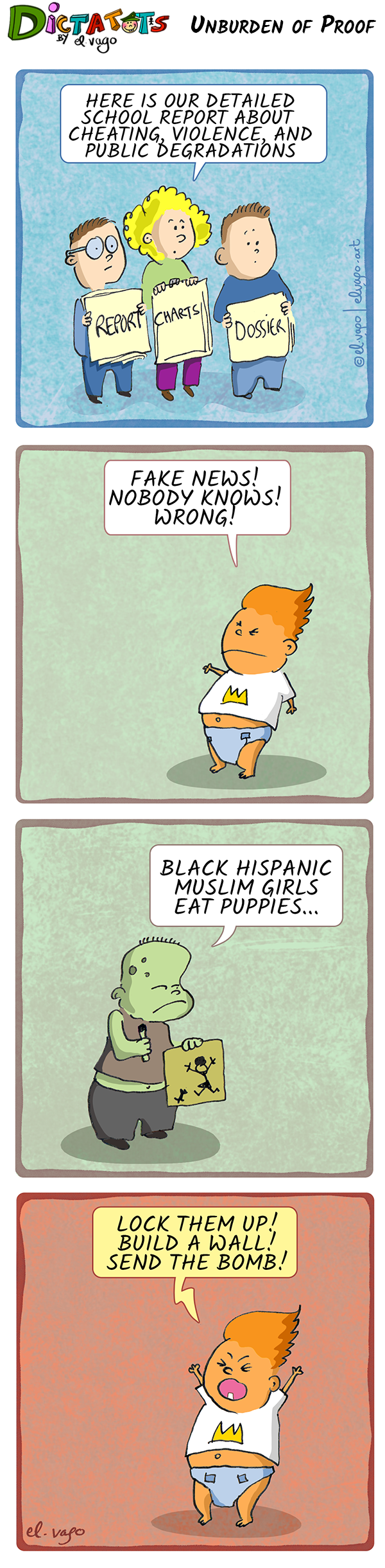 DictaTots is a bemused sociopolitical satire inspired from the actions and words of real live people recast as tyrannical toddlers.
