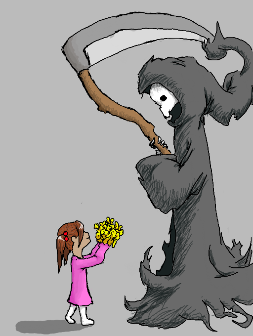 This is actually a redraw of something I drew in my sketch book that was based off this cute picture of a squirl holdng an acorn in front of a grimreaper while looking for some kind of symbol to show death for a ghost character I made (one that is not on the internet)