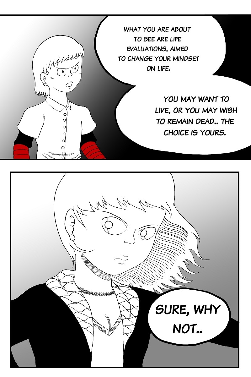 Carol is a young boy who has just committed suicide. He is enveloped with red ribbons around his wrist as a symbol for his cause of death. He meets a young girl with mysterious powers who tells him that he can reverse his suicide as long as he regains the will to live through a series of life evaluations. Will these adventures cause him to live again, or stay dead?