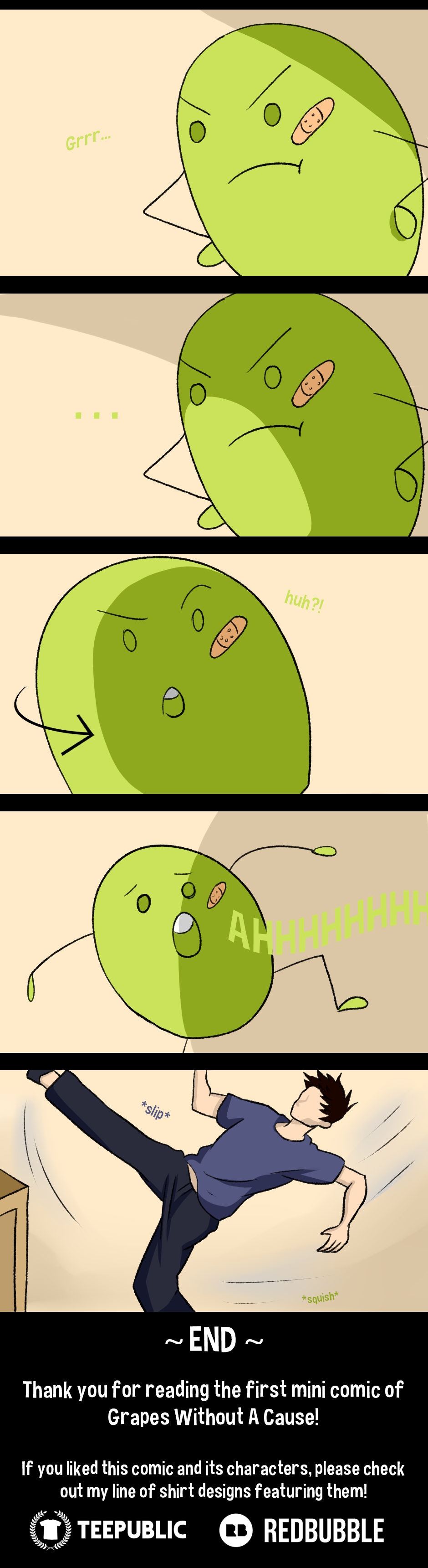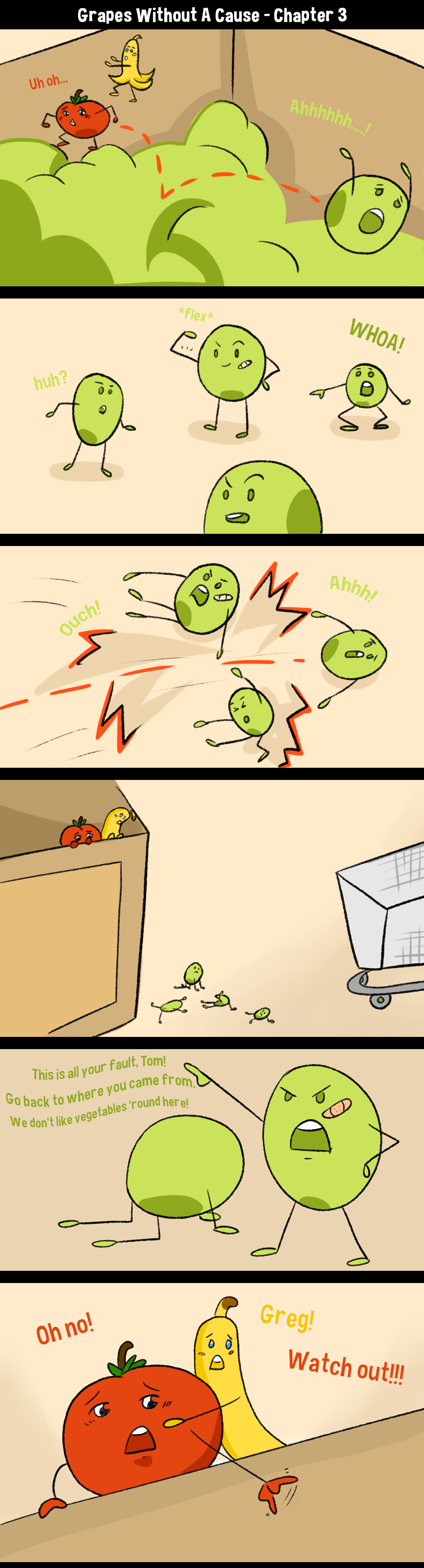 After being plucked out of his home tray in a grocery store fruit department and being placed in an unfamiliar environment, Tom the tomato soon finds himself in a bit of trouble. Greg and his gang of grapes don’t like strangers, especially “vegetables”! Tom’s unfriendly encounter is cut short thanks to a helpful banana, Brianna, who is more than familiar with Greg and his unsavoury behaviour. She escorts Tom away from the punkish gang of fruit but to their misfortune, karma decides to use Tom’s clumsiness as a vessel to wreak havoc on the grapes.