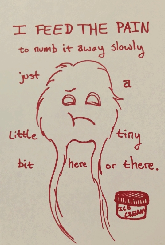 The food of choice varies, but ice cream is usually a safe go-to. I have many healthy options too (raw almonds, kale, fruits, all things I love) but as it's not eating for hunger it cannot really be called eating healthy.