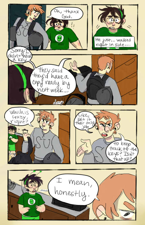 Their expressions are great. Your linework could use some variation, thicker lines around the outsides of the characters will help them stand out more. (Doesn't have to be super thick or anything) I think this comic so far! The pacing is really good and the comedy is on par. The simplistic colors work really well. You got a subber from me. :)