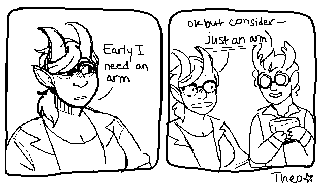 Baby's first comic <3 featuring Vera and Early! Early likes to add some creativity to his inventions but all Vera needs is a prosthetic NOT a TOASTER!