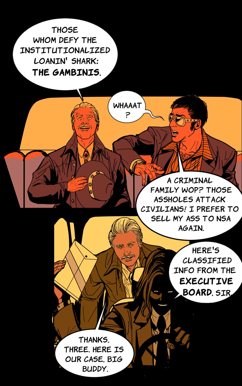 WARNING: VIOLENT CONTENT +18 ENGLISH SPEAKER (PRO) EDITOR FROM CHAPTER 5 ONWARD. Self-contained Graphic Novel. A Sicilian mafia boss' daughter started the Third Mafia War when she broke the rules and became a made member. To survive, she gives her best, but this skill showcase catches undesirable attention. Now a mercenary company, the Kings' Club, wants her to join them. And they won't take no for an answer. A Thriller Pulp Neo-noir comic with a leading lady.