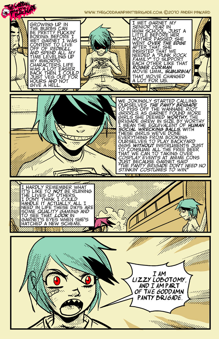 The goddamn panty Brigade are a wild, drunk, violent and self-centered group of Geek Alt Girls. Lead by Garnet Gutterslut, these rambunctious girls act first and deal with the consequences later! read with caution! you just might fall in love!