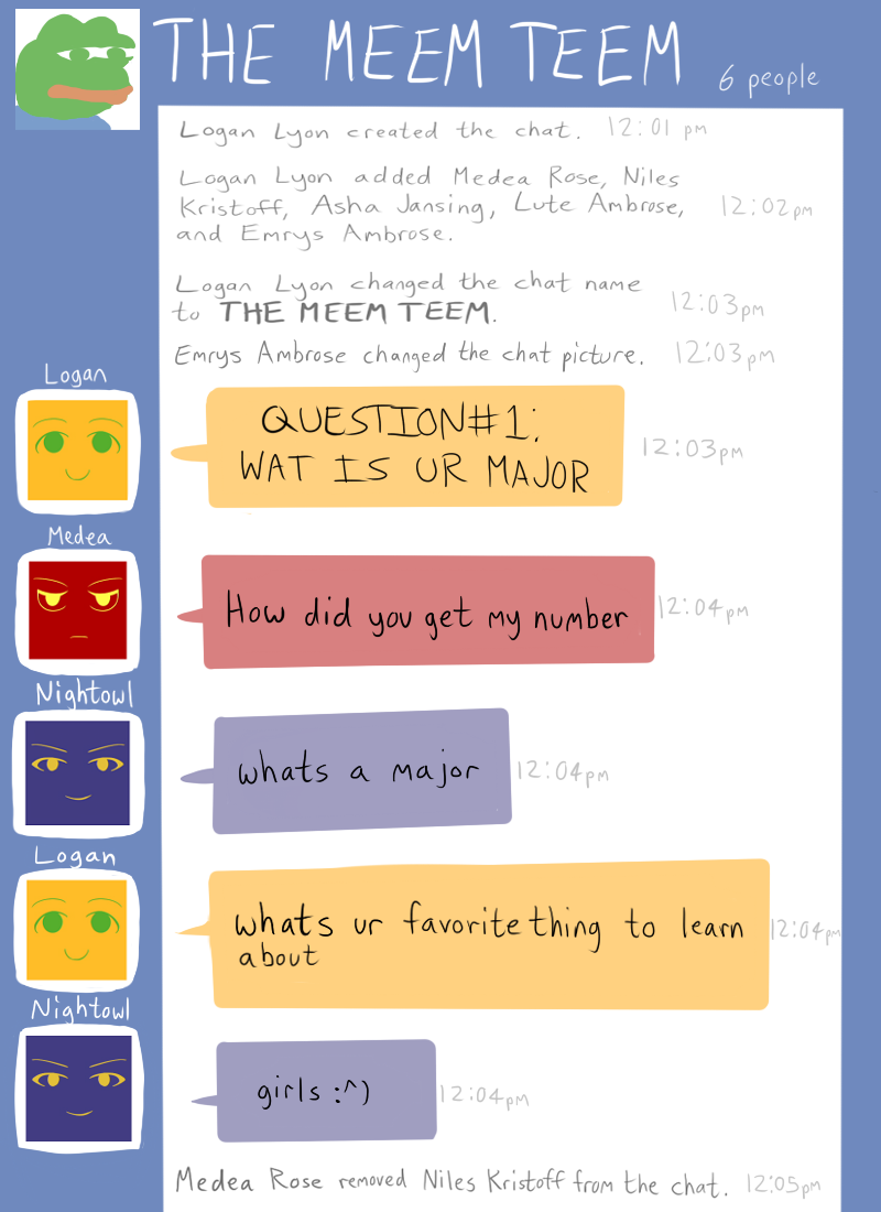 One college freshman at Inter-Dimensional Academy is Logan Lyon, the protagonist with a protagonist complex. She teams up with five other young humans to take on the universe and its mysteries, including the complexities of the human mind, the up-to-now unexplained appearance of the newfolk, and dank memes. Not a lot of learning goes on at this school.