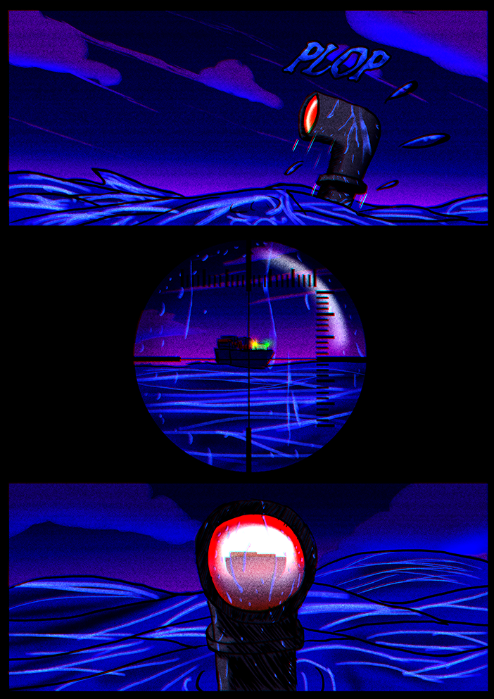 A mysterious shark-like submarine starts using it's periscope and starts to see something from the distance. As if it's searching for something ...