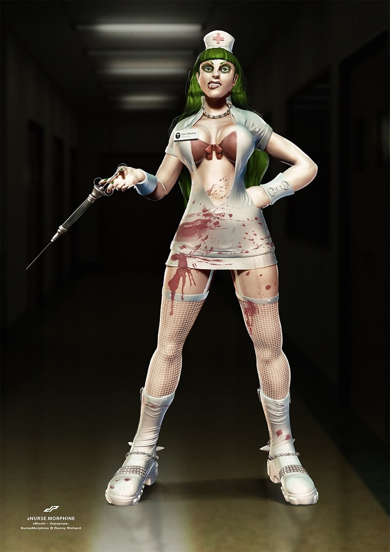 Mistress Morphine in 3D by the legendary Creature Feature artist Dopepope! As she's in 3D now theoretically we could have Morphine pop up in a 3D fighting game, or make a statue...