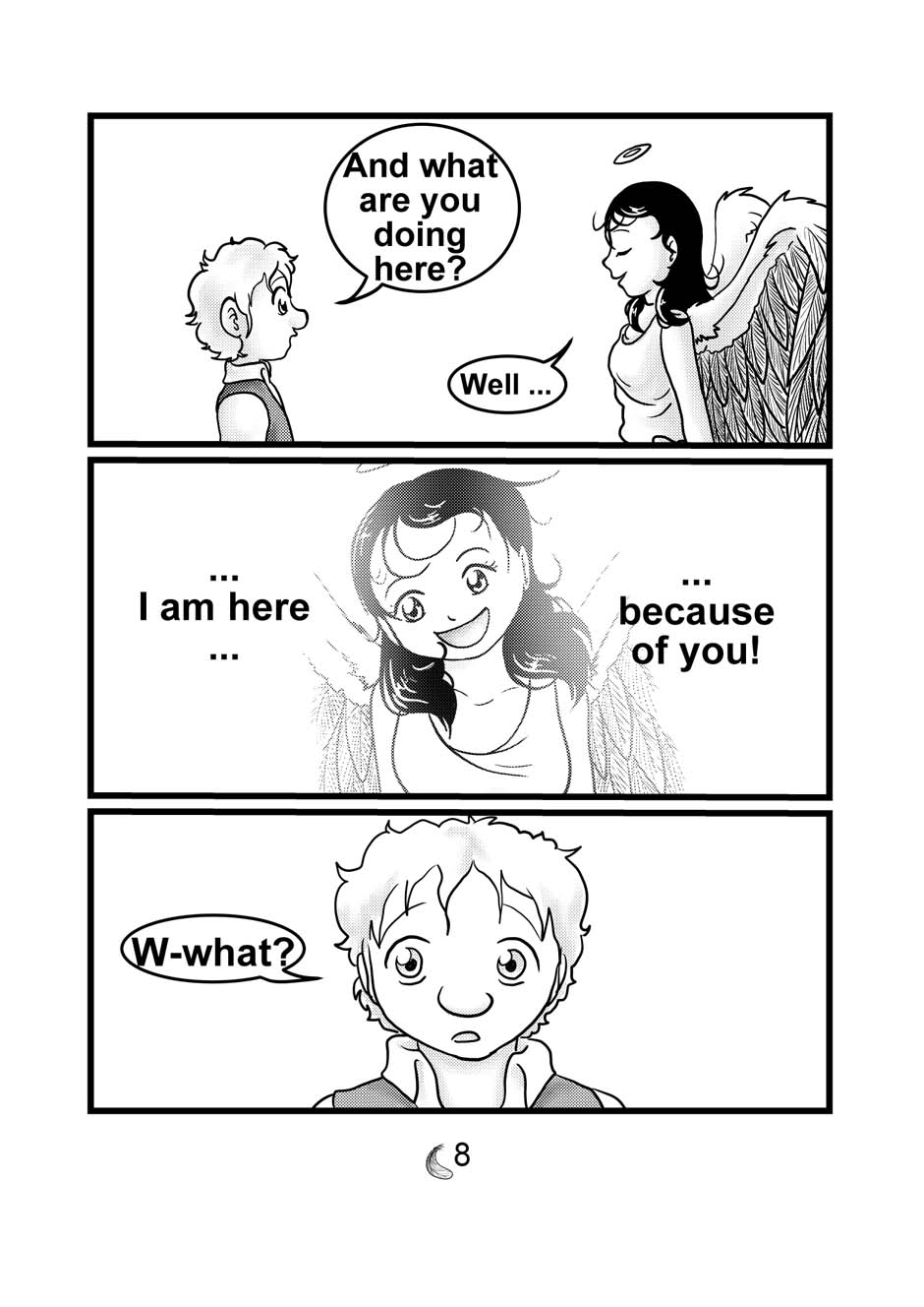 The angel Azaria is send to earth to cheer unhappy people up. She’s listening to their sorrows and gives solace with nice words. But people react more and more thankless and Azaria begins to have doubts about her work until everything changes for her in an apparently impasse.