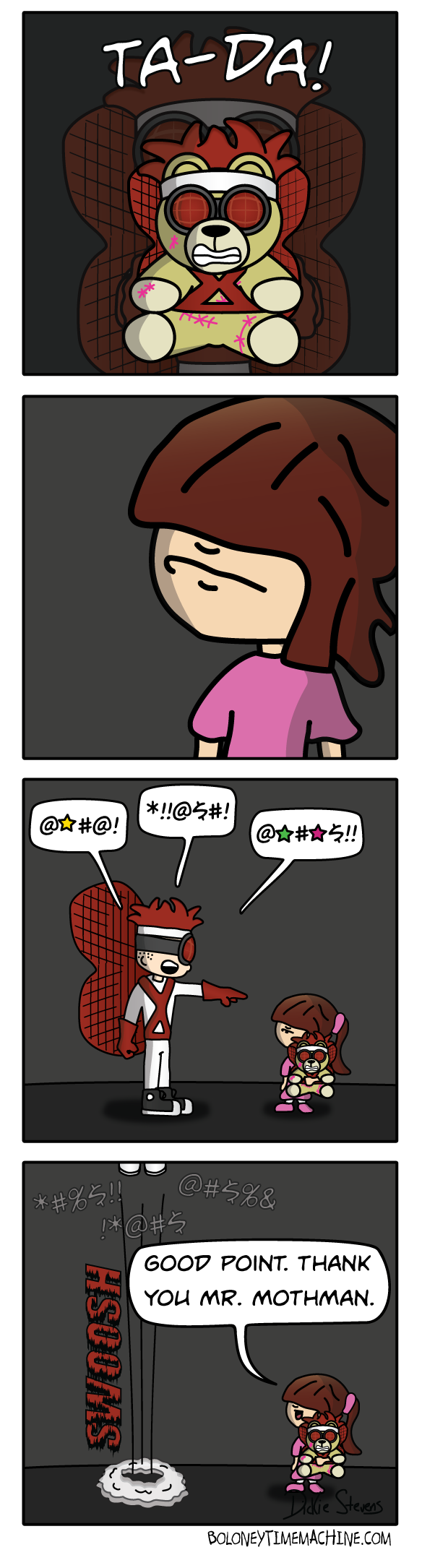 Boloney Time Machine (BTM) follows Hero and Sidekick, a pair of superheroes who just joined The Society of H.A.V.V.O.C. (Heroes, Antiheroes, Vigilantes, Villains, & Other Characters). They have the potential to be epic, but half the drive to do it.
