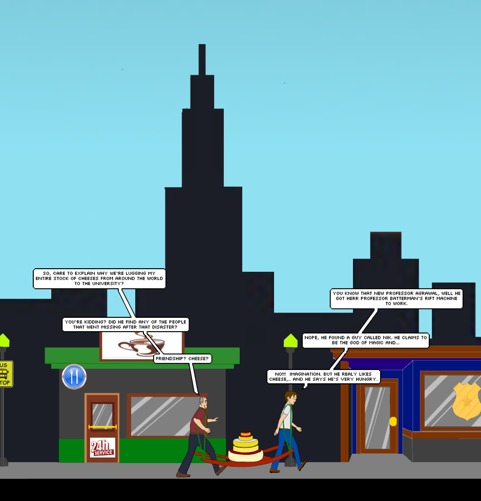 Drawing 1: William and Carl moving all Carls cheese to the Lab.