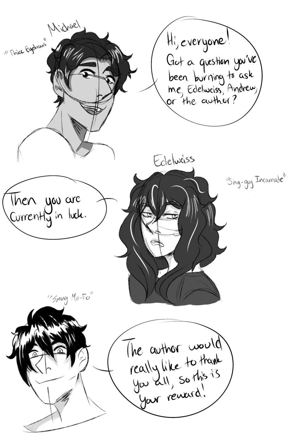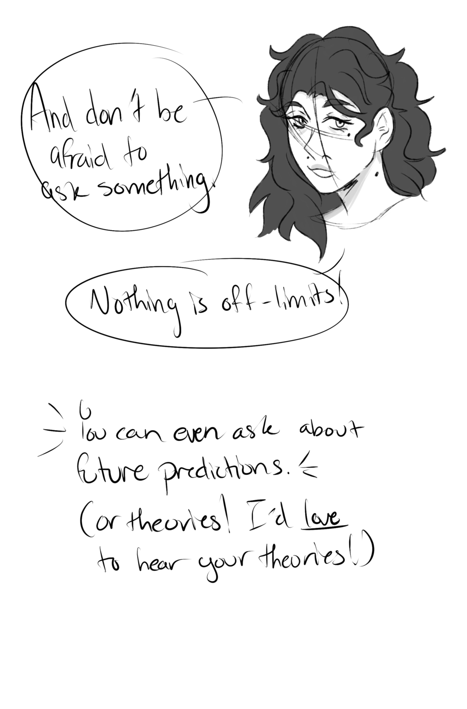 2) I'll either confirm or deny it if it's a theory, or if it's a question I'll draw it!