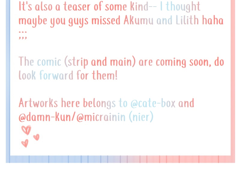 If you're interested to see future doodles of Akumu and Lilith by both of us, feel free to follow our public art acc! Mine is aonecosan @ pw, aoneco-san @ dA, and cate-box @ instagram. Nier's would be micrainin @ instagram and damn-kun @ dA.