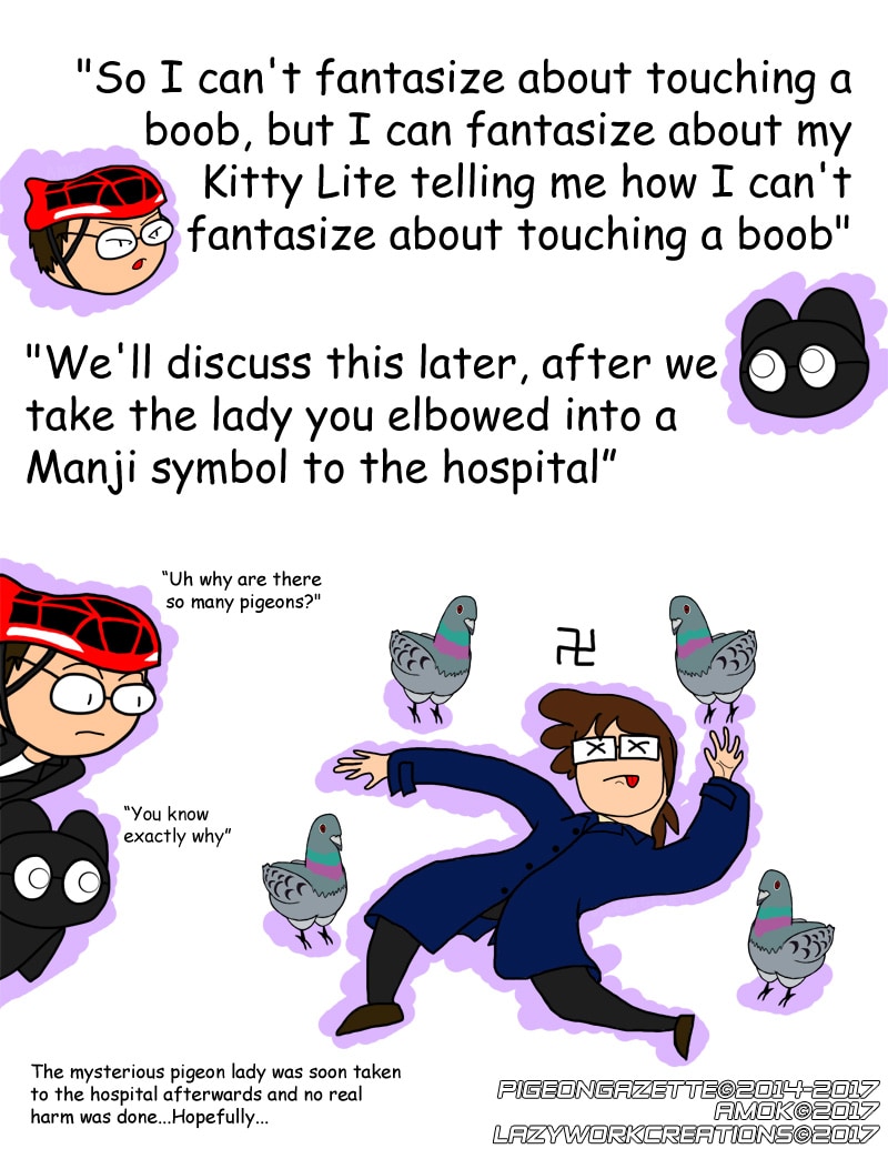 Shout outs to Pigeon Gazette for being one of the few artists I’ve been reading to inspire me to make webcomics and draw again, check her webcomic out. Jane I hope this strip didn’t offend you in anyway, I’m sure you’re a lovely person because I love reading your comics along with others ;P I drew pigeons