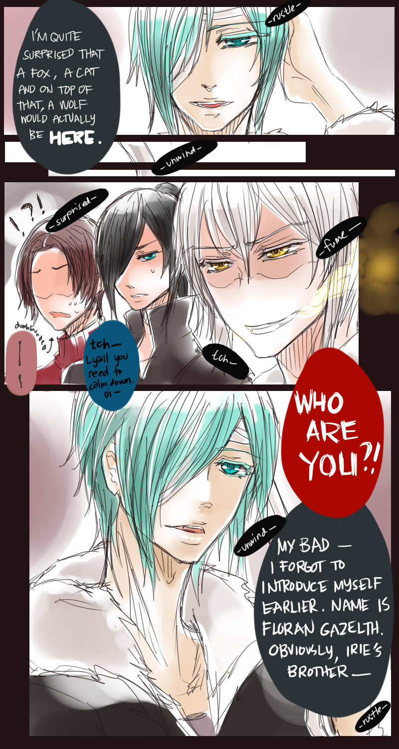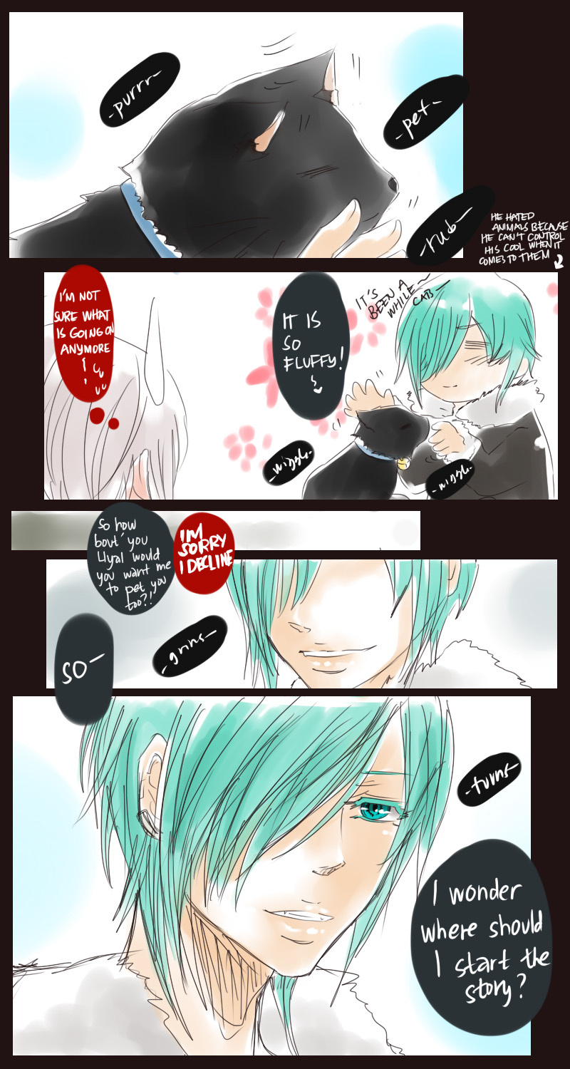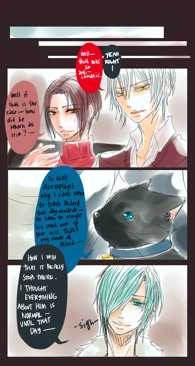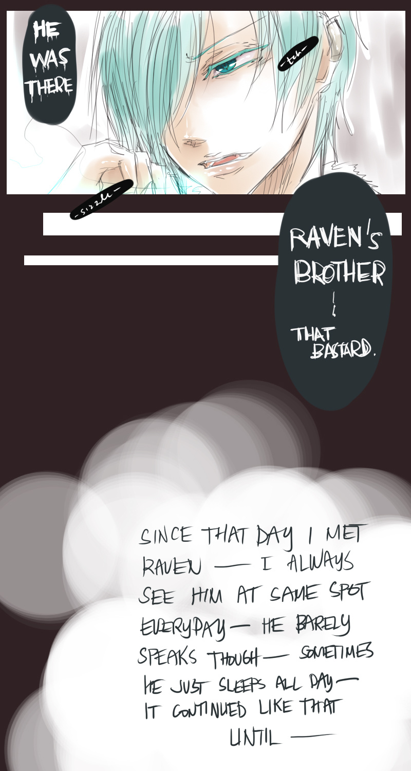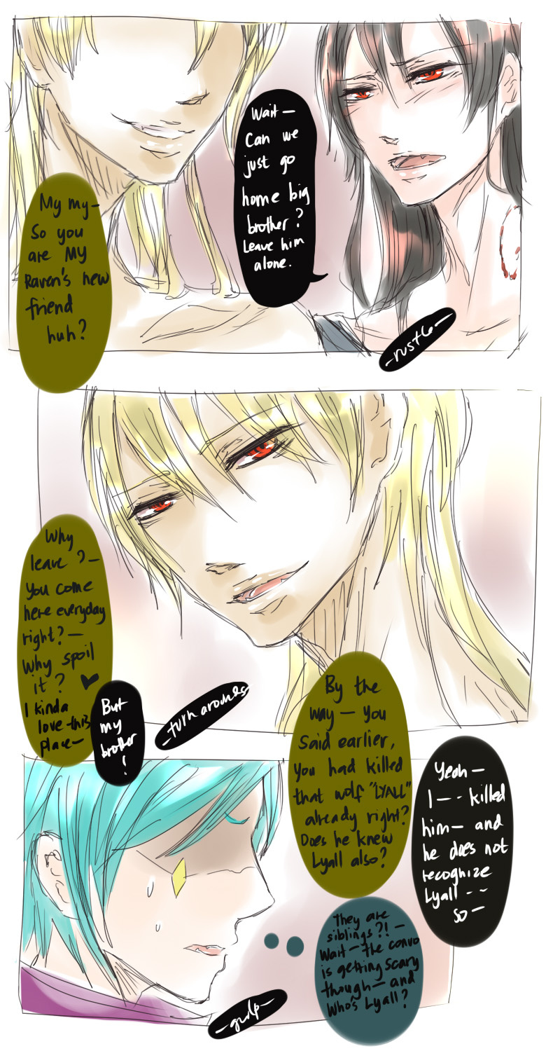 A bl/yaoi sketch webcomic that revolves around Irie Lloyd, a supposed-to-be normal 19-year old college student, turned out to be a reincarnation of "Raven". Raven is one of the oldest noble pureblood vampire known as the Black Bird. His bestfriend, Ian, who turns out to be an Astral Fox. The cat he's petting for years, Lily, who turns out to be his old familiar back then (a cat demon spectre). And the wolf who he sealed for long time, Lyall, who turns out to be his past lover. What will happen to Irie's normal human life? Would it remain the same? What are the secrets to be told about his own whole-being?
