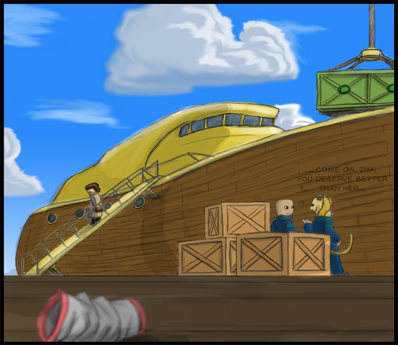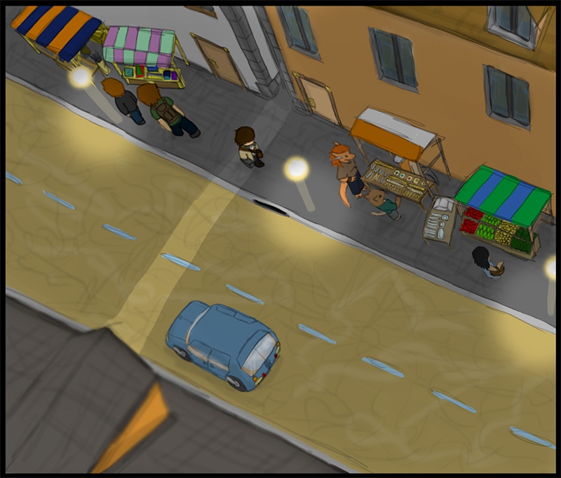 Much more detail here than previous pages, i approve of this. Shading is much better, i think. Clouds look better than before, but they are still outdated. Halfway through making this, i've realized that windows aren't light, they're dark with reflections. Decided to change it, but added time and...Yeah. There were issues with this one, had to work around them and, thus, this page took longer to finish than it really was worth. As always, room for improvement.