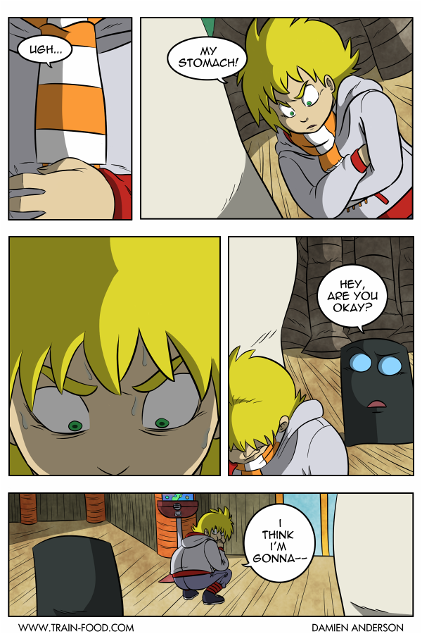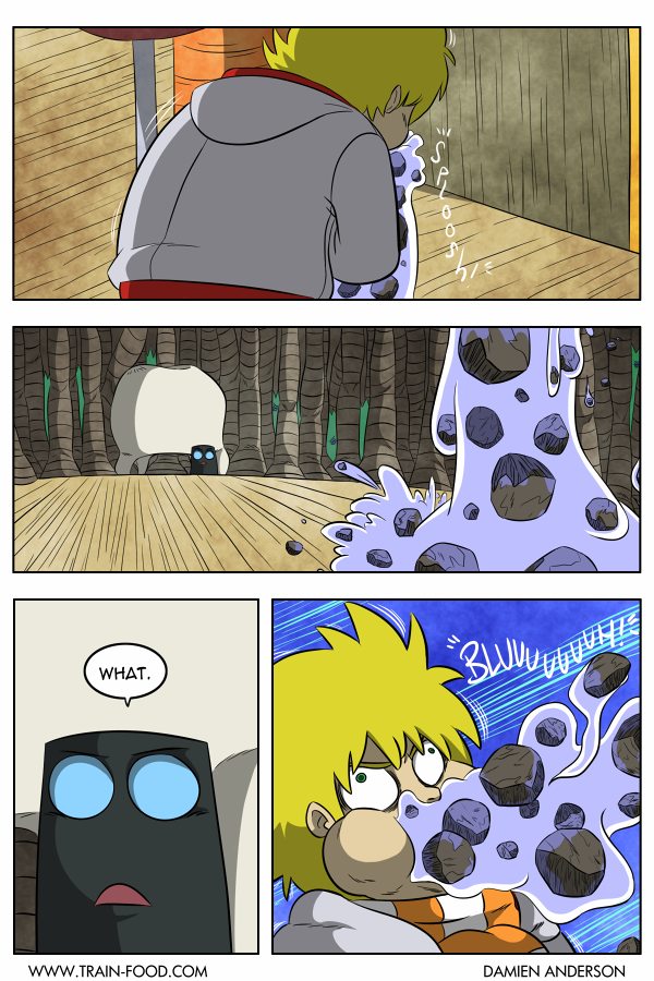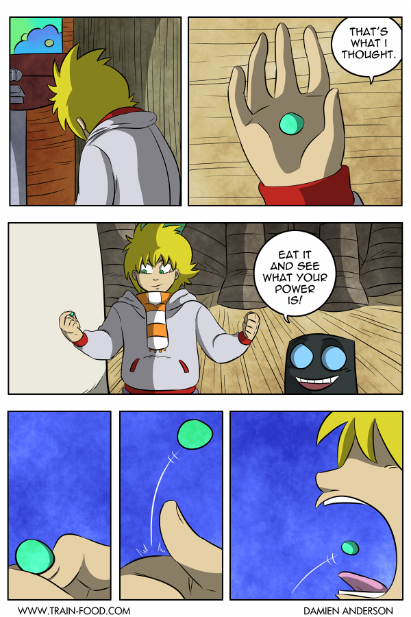 Train Food is an all-ages action adventure story in which a young boy awakens in a strange world where he befriends a variety of unusual creatures including an alien, a talking shadow, and a giant tooth. After receiving random powers from a gumball machine, they travel deep into the heart of The Land, to fight the almighty SOLAR KING!
