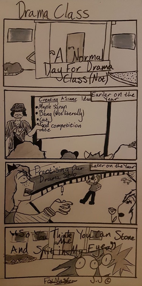 Ahh drama class, such fun and hard work, can anyone guess where that last line in the last panel is from?