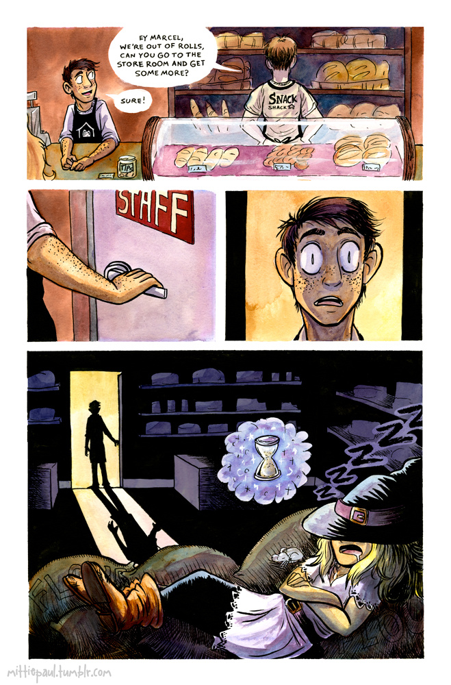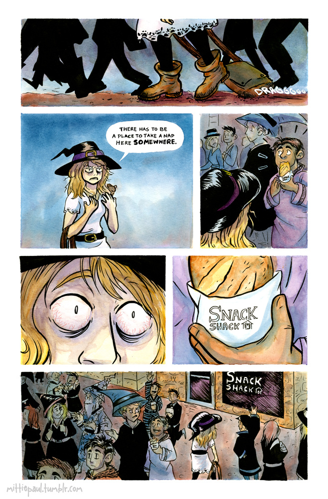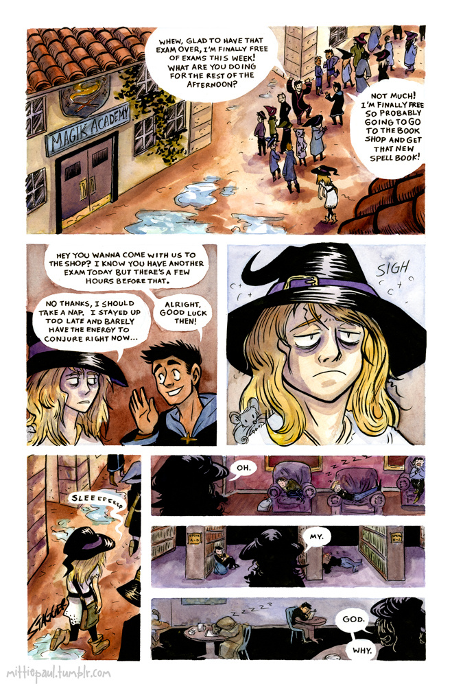 This 3-pager about a witch college student who just wants a nap was sort of a challenge to myself to do a comic entirely traditionally. It was inked, watercolored, and lettered by hand. It was an assignment for one of my comic classes.