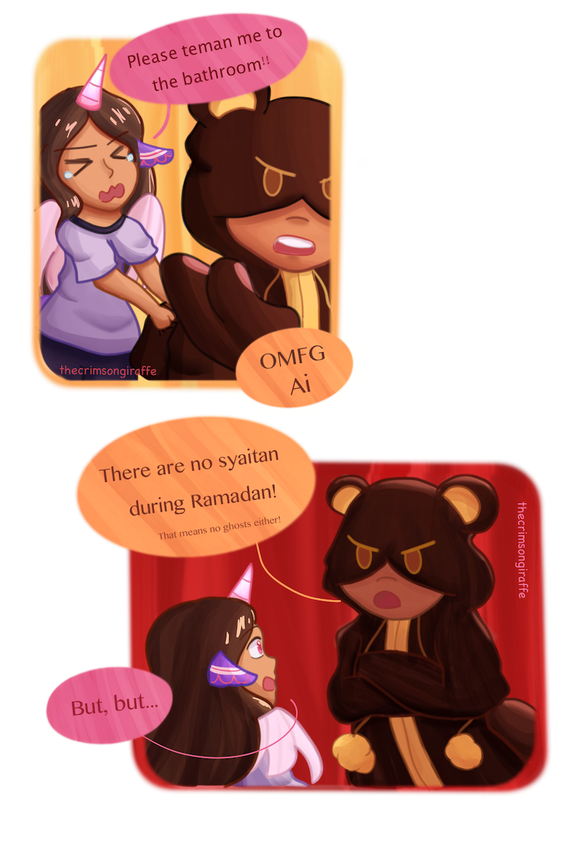 teman= accompany syaitan= devil, demon One of my favorites! I got to experiment with poses and panel composition here