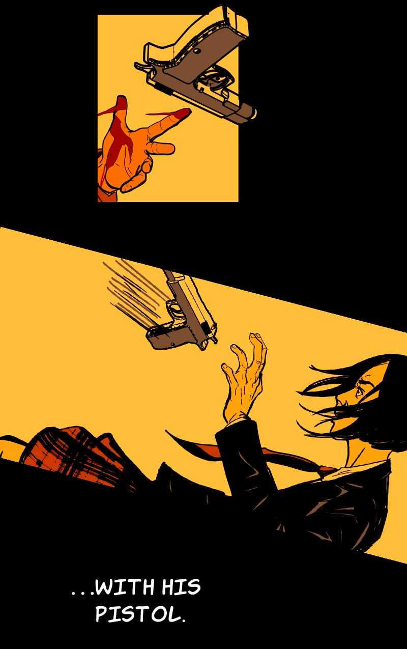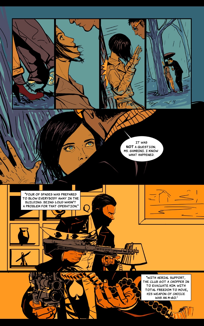 WARNING: VIOLENT CONTENT +18 ENGLISH SPEAKER (PRO) EDITOR FROM CHAPTER 5 ONWARD. Self-contained Graphic Novel. A Sicilian mafia boss' daughter started the Third Mafia War when she broke the rules and became a made member. To survive, she gives her best, but this skill showcase catches undesirable attention. Now a mercenary company, the Kings' Club, wants her to join them. And they won't take no for an answer. A Thriller Pulp Neo-noir comic with a leading lady.