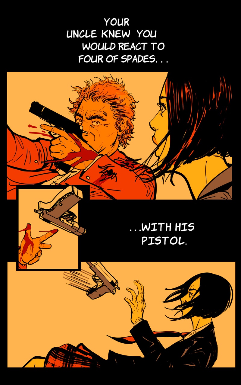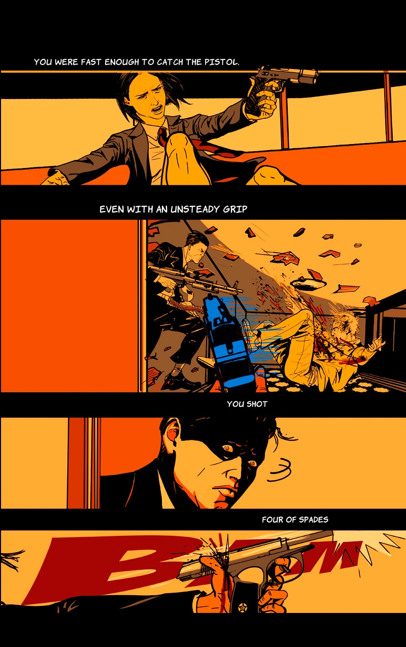 WARNING: VIOLENT CONTENT +18 ENGLISH SPEAKER (PRO) EDITOR FROM CHAPTER 5 ONWARD. Self-contained Graphic Novel. A Sicilian mafia boss' daughter started the Third Mafia War when she broke the rules and became a made member. To survive, she gives her best, but this skill showcase catches undesirable attention. Now a mercenary company, the Kings' Club, wants her to join them. And they won't take no for an answer. A Thriller Pulp Neo-noir comic with a leading lady.