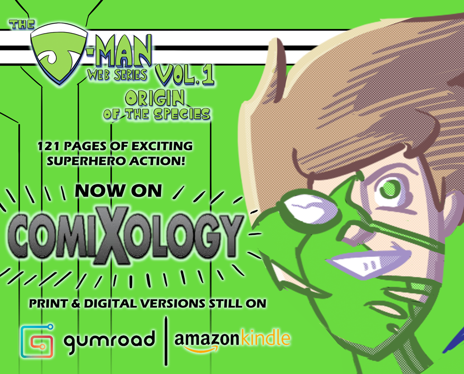 GOOD NEWS, EVERYONE! The J-Man Vol 1 is now available on Comixology, the premier comics reading site on the web! It's $9.99 and you get everything to read on your computer, tablet, or mobile. Don't forget you can still get it for Kindle, or for a few extra dollars you can get a physical version on gumroad.