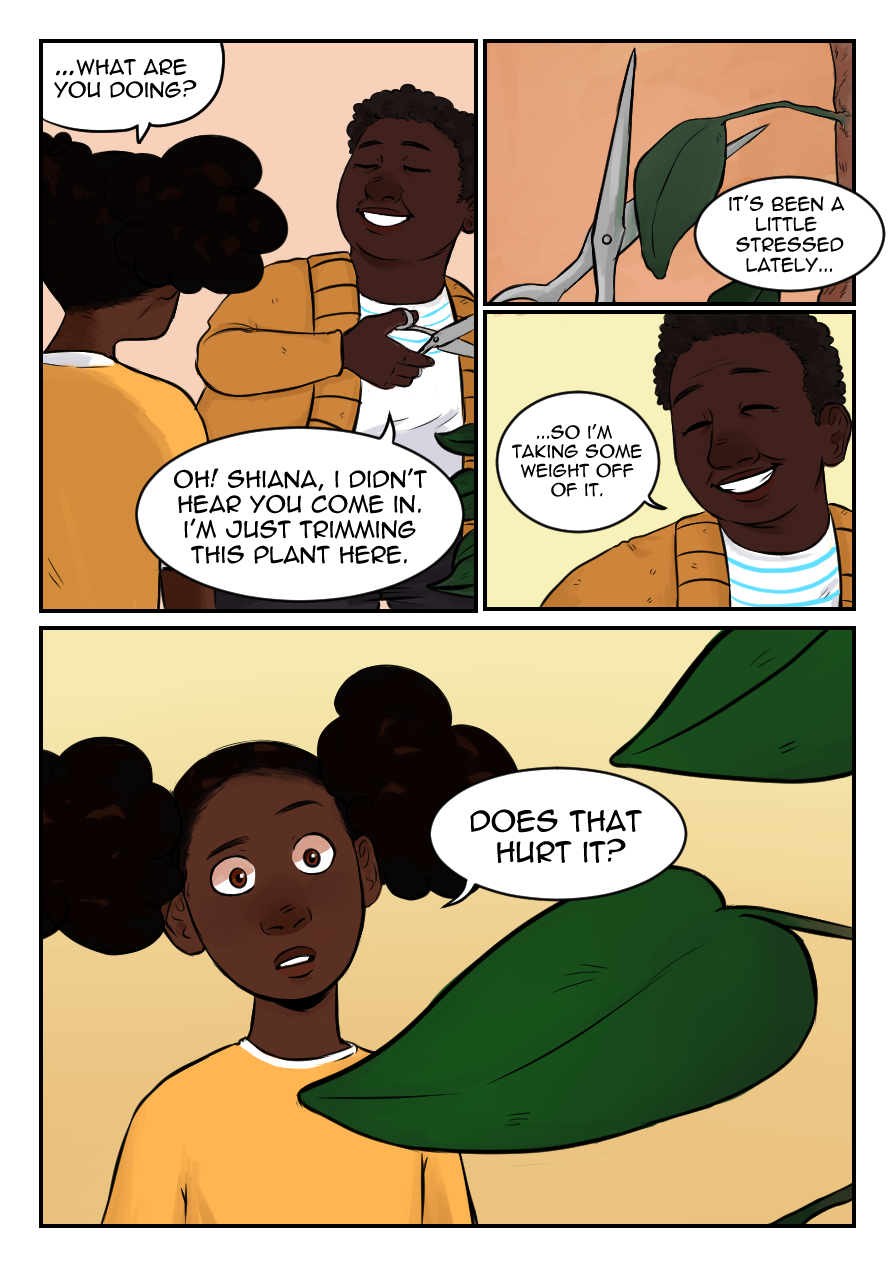 the rest of chapter 2 will be published once its finished. theres 12 more pages left but im working everyday on them. I think it'll be a lot easier to dump the rest of the chapter than to have you guys wait weeks for the pages. also, i know like nothing about plants so if im wrong about the trimming part oh well