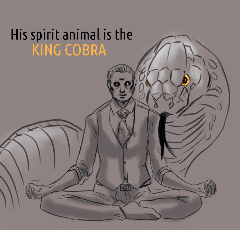 That was a pretty interesting question (and also a really interesting one for the story of Exoterism and for what will happen next on the Adventures of Were!Will, so thanks anon!). So, here's their spirit animals: the solitary, cannibal, biggest venomous snake in the world, king cobra, and the protective, fierce, smart and empathic wolf.