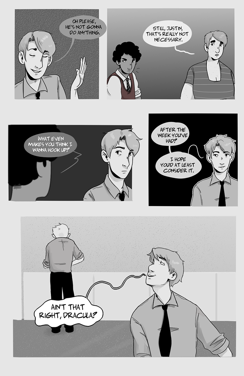 Counting Heartbeats is a slice of life comic about two accountants, Jon and Drax, who are trying to figure out how to get along. The situation only gets stickier when Jon accidentally stumbles upon Drax's most guarded secret: He isn't exactly human.