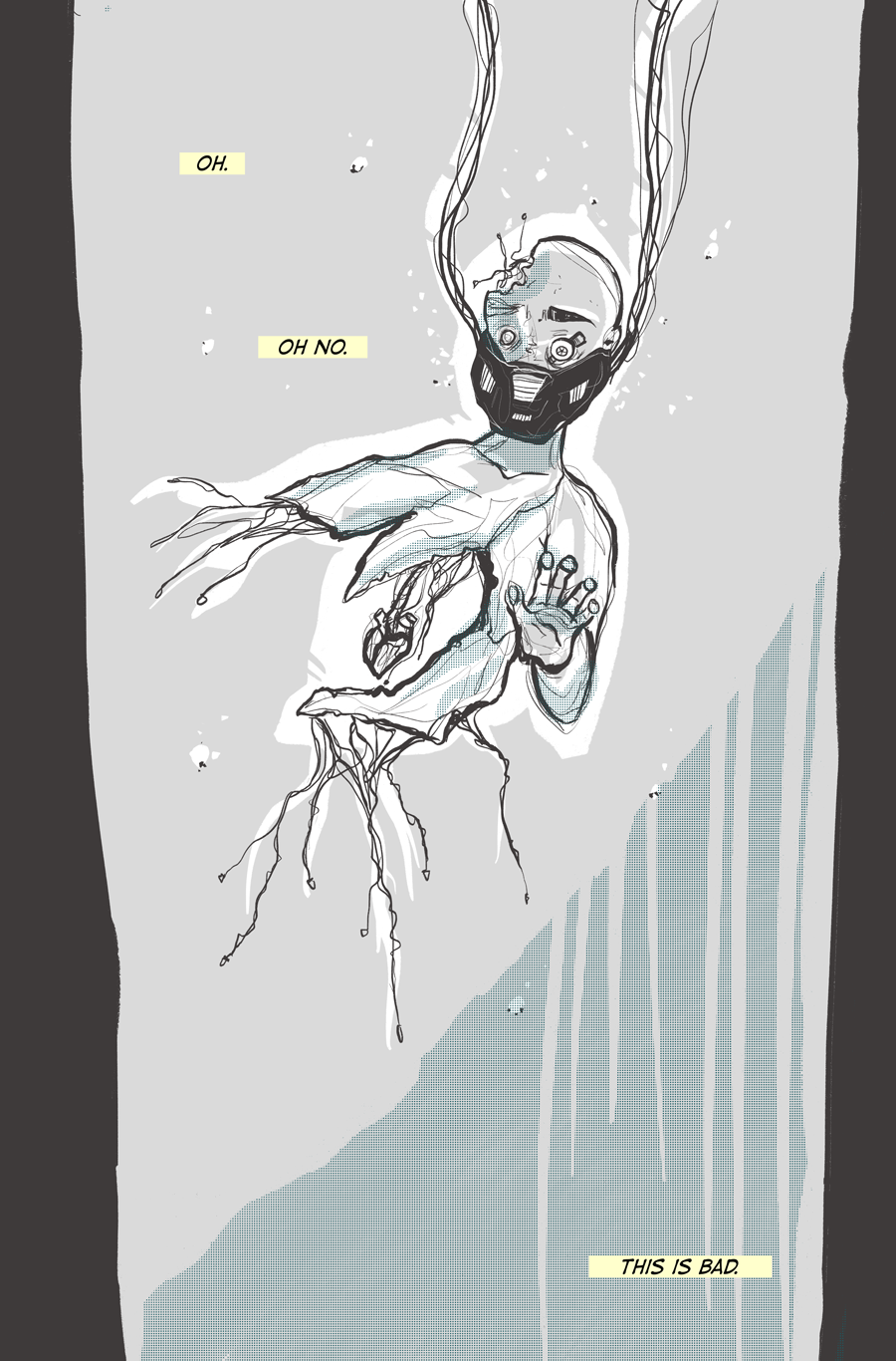 This page was the first thing I imagined when Eric and I started throwing around ideas for this comic. Soon as my brain latched on to that image of a half-together body floating with a heart sticking out, I knew we had to make this comic happen. Oh what the future holds…