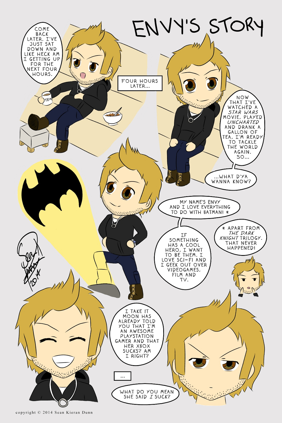 Welcome to the backstage world of gamers, writers and artists! Monty is an artist who has just moved in with his four closest friends; Moon the videogame master, Envy the superhero wannabe, Jardi the cosplay Queen and Jolt the computer genius.