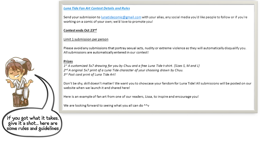 We're holding a fan art contest! Please join in, you're more than welcome to! send all submissions to Lunatidecomic@gmail.com