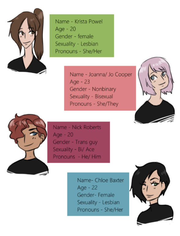DAFSGDFGEFH THE REPRESENTATION!!! YOU HAVE AN ASEXUAL!!! A TRANS ASEXUAL!!! A TRANS BIROMANTIC ASEXUAL!!! AND A NONBINARY BISEXUAL!!! I LOVE YOU!!!