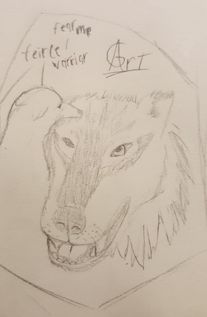 Was at the library (yes, they still exist) and found a picture like this in a book (also still exist). I wanted to draw the wolf showing its teeth but not make it look mean. Success!?
